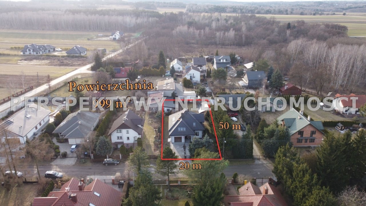 Działka o powierzchni 999 m² i wymiarach około 20 × 50 m jest ogrodzona i zagospodarowana.