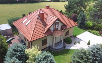 Dach pokryty jest dachówką ceramiczną w kolorze cegły.