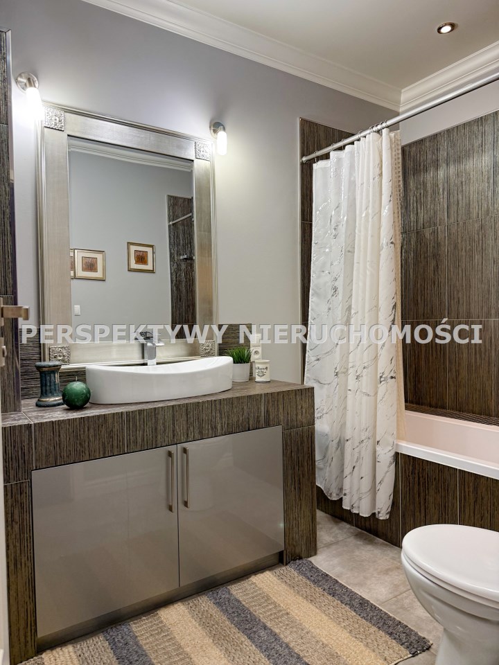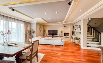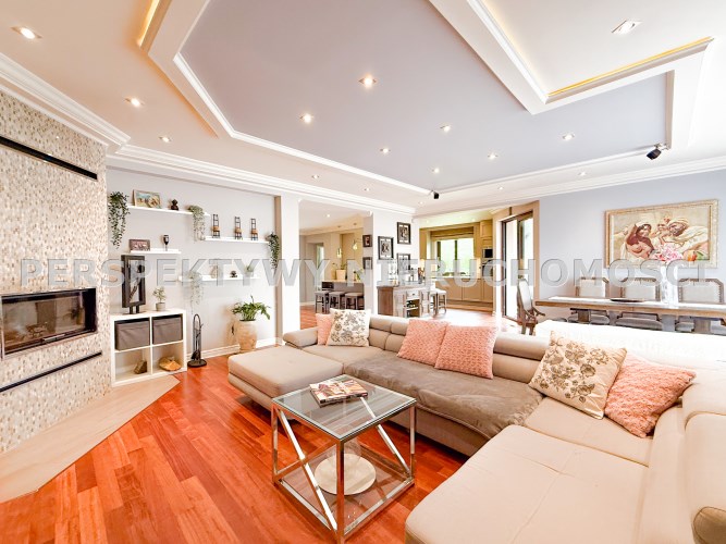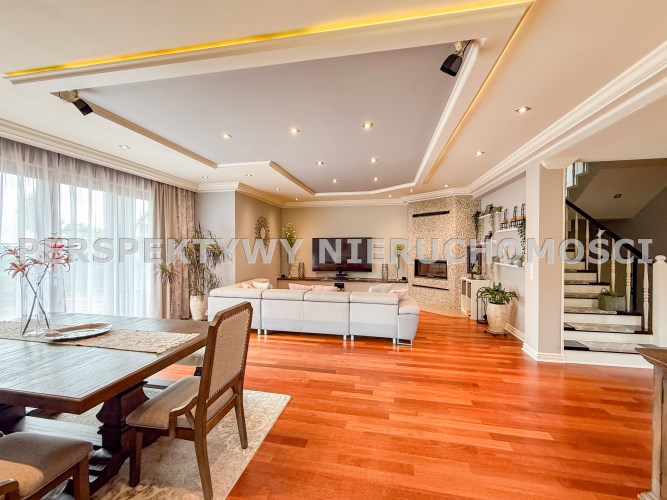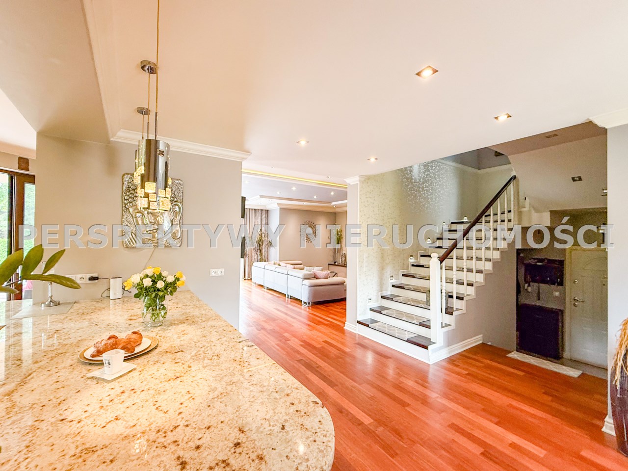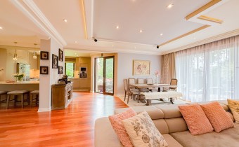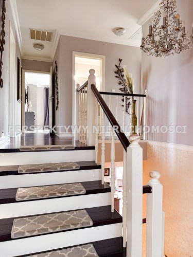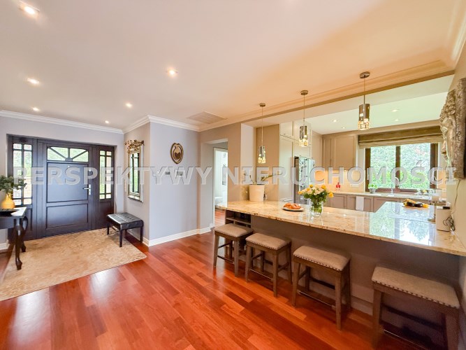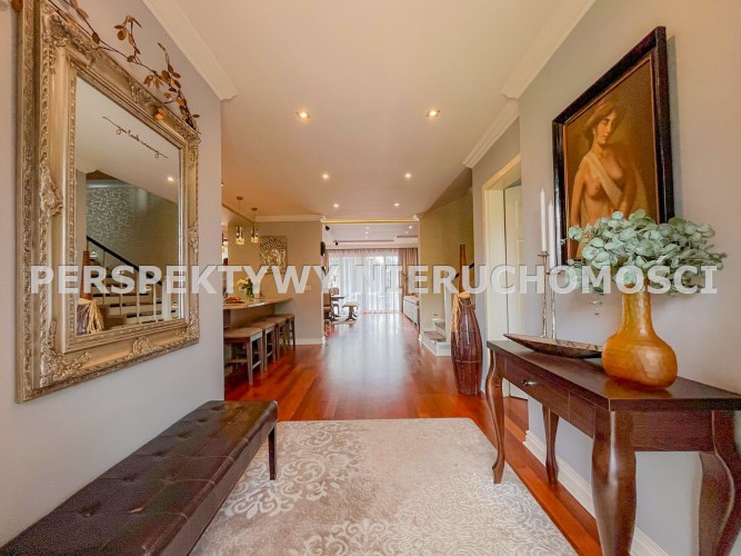 Przestronnie i stylowo zaprojektowane przestrzenie przez projektanta wnętrz to atut, który zdecydowanie podkreśla wyjątkowość tej nieruchomości. Każdy detal robi bardzo pozytywne wrażenie, począwszy od samego wejścia idąc przestronnym przedpokojem. Kierując się na prawo znajdujemy gabinet,  po lewej  toaleta dla gości wraz z zamknięta pralnią. Od wejścia zachwyca widok  otwartej części salonowej i kuchennej. Aranżacja wnętrza sprawia, że czujemy się tu jak na planie filmowym.