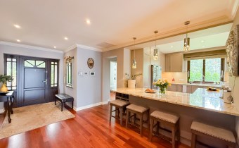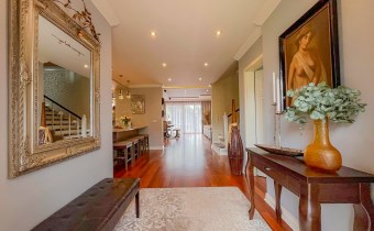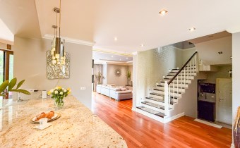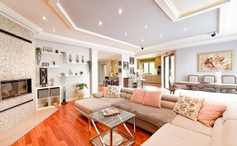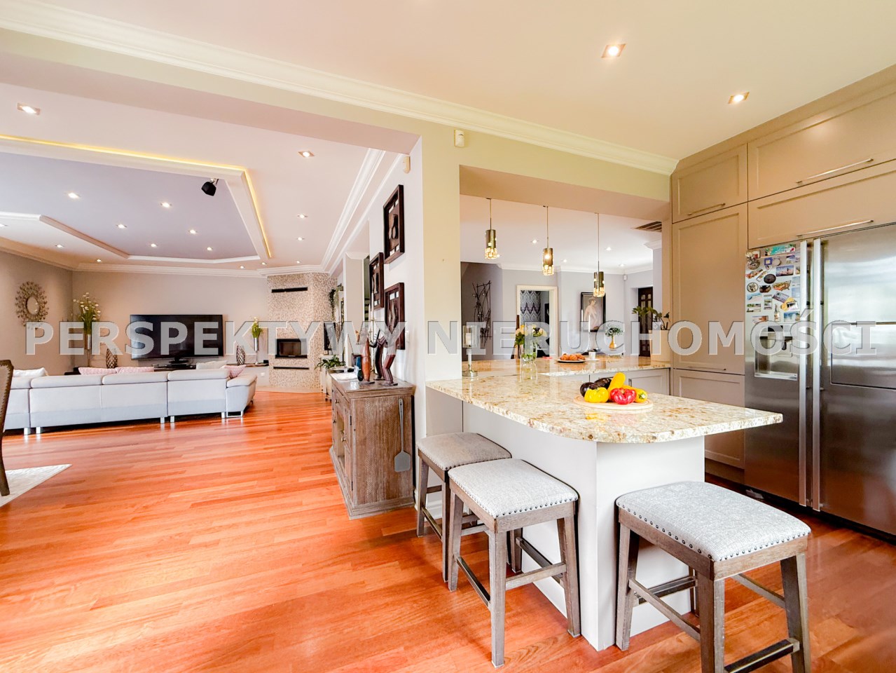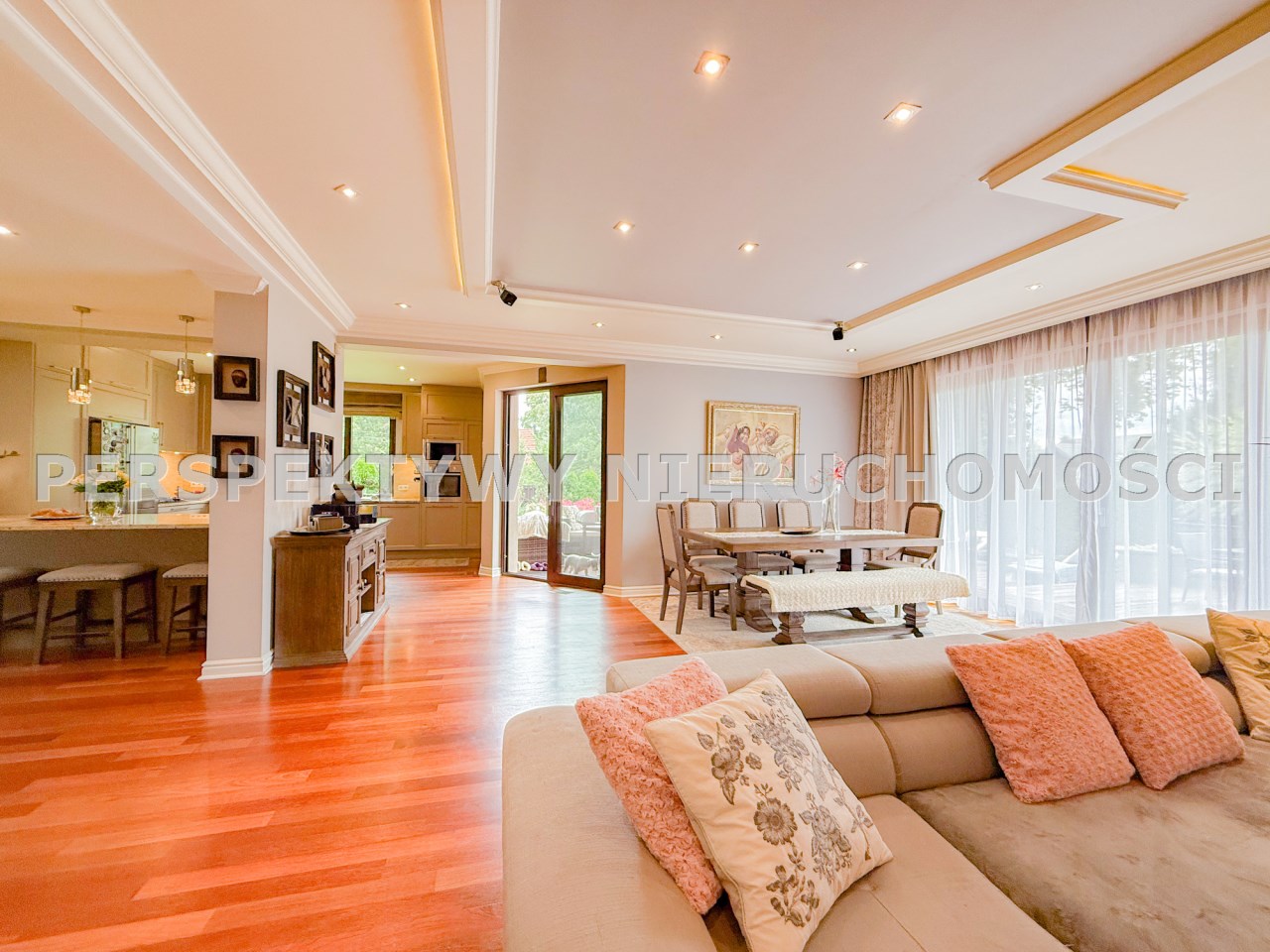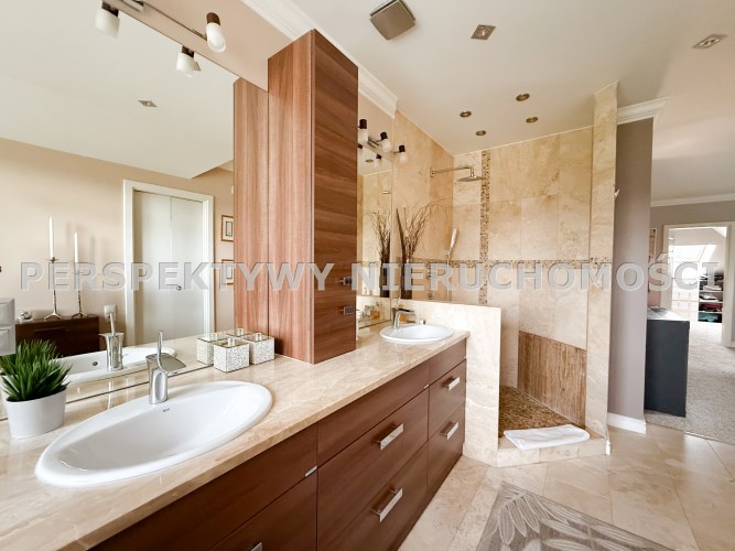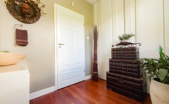 Przestronnie i stylowo zaprojektowane przestrzenie przez projektanta wnętrz to atut, który zdecydowanie podkreśla wyjątkowość tej nieruchomości. Każdy detal robi bardzo pozytywne wrażenie, począwszy od samego wejścia idąc przestronnym przedpokojem. Kierując się na prawo znajdujemy gabinet,  po lewej  toaleta dla gości wraz z zamknięta pralnią. Od wejścia zachwyca widok  otwartej części salonowej i kuchennej. Aranżacja wnętrza sprawia, że czujemy się tu jak na planie filmowym.