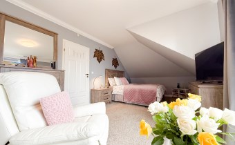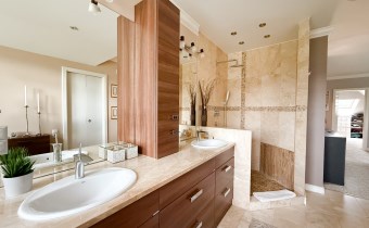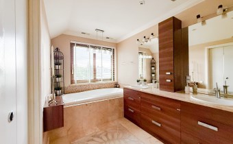 Druga największa sypialnia to przestrzeń do relaksu z otwartym pokojem kąpielowym, zarówno z wanną i prysznicem oraz dwiema umywalkami.