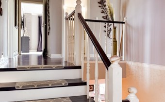 Pośrodku salonu na piętro prowadzą klimatyczne schody. Stylistyka malowania oraz dekoracje, dają efekt klasy i zarazem przytulności.