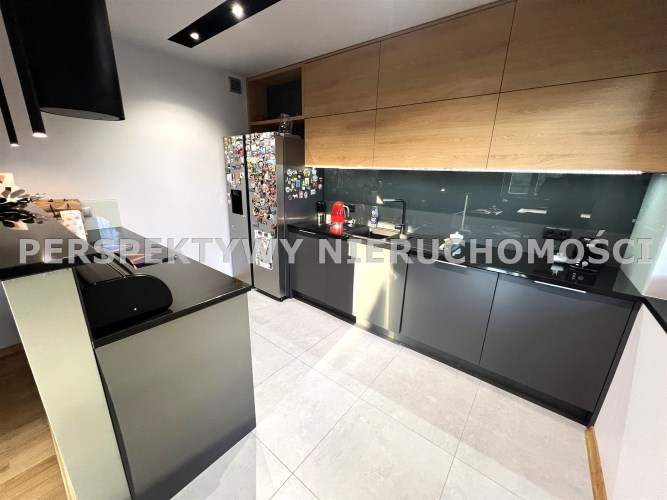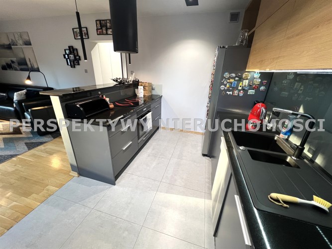 - ANEKS KUCHENNY POŁĄCZONY Z SALONEM: 9,4 m², pomiędzy salonem i aneksem wyspa z bufetem, z płytą elektryczną, piekarnikiem i pochłaniaczem, aneks kompletnie umeblowany i wyposażony, duża 2-drzwiowa lodówka z zamrażarką, zmywarka, zlewozmywak z baterią ekspres do kawy,