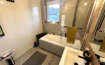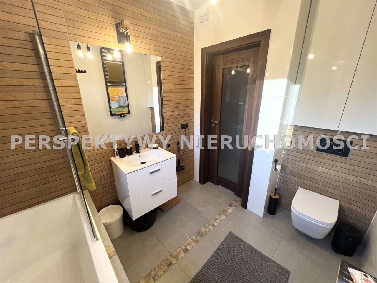 - ŁAZIENKA Z WC: 5,4 m², z oknem, wanna z prysznicem ze szklaną rozkładaną przesłoną, umywalką z szafką podumywalkową, duże lustro wklejone z podświetleniem, sedes podwieszany, duża wbudowana szafka łazienkowa,